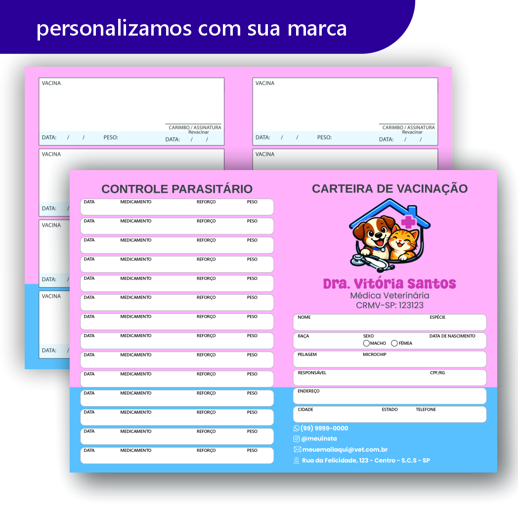 A carteira de vacinação ideal para clínicas, hospitais, consultórios veterinários e atendimentos domiciliares. Produzida com materiais de alta qualidade, é resistente, prática e transmite confiança aos tutores de pets.