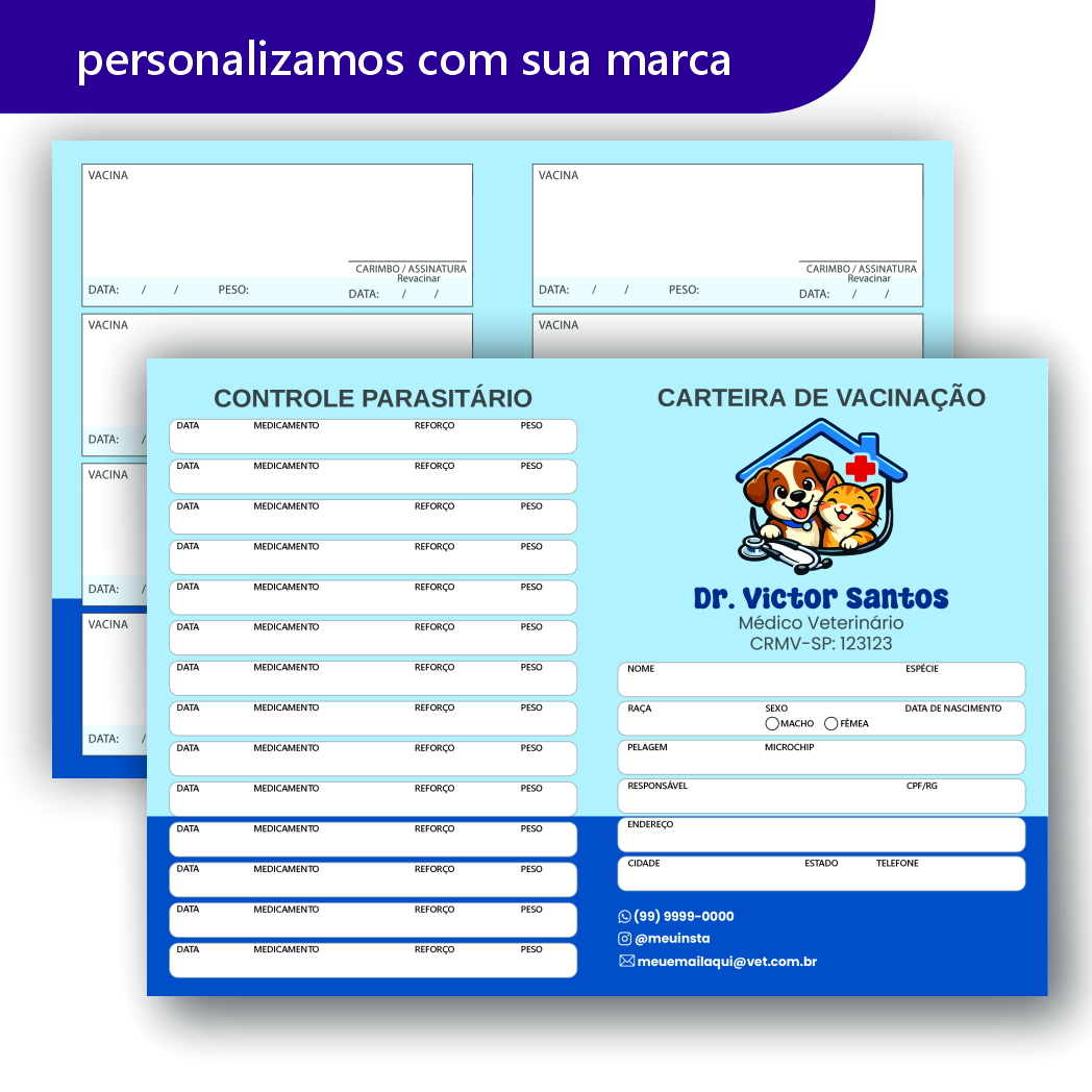 A carteira de vacinação ideal para clínicas, hospitais, consultórios veterinários e atendimentos domiciliares. Produzida com materiais de alta qualidade, é resistente, prática e transmite confiança aos tutores de pets.
