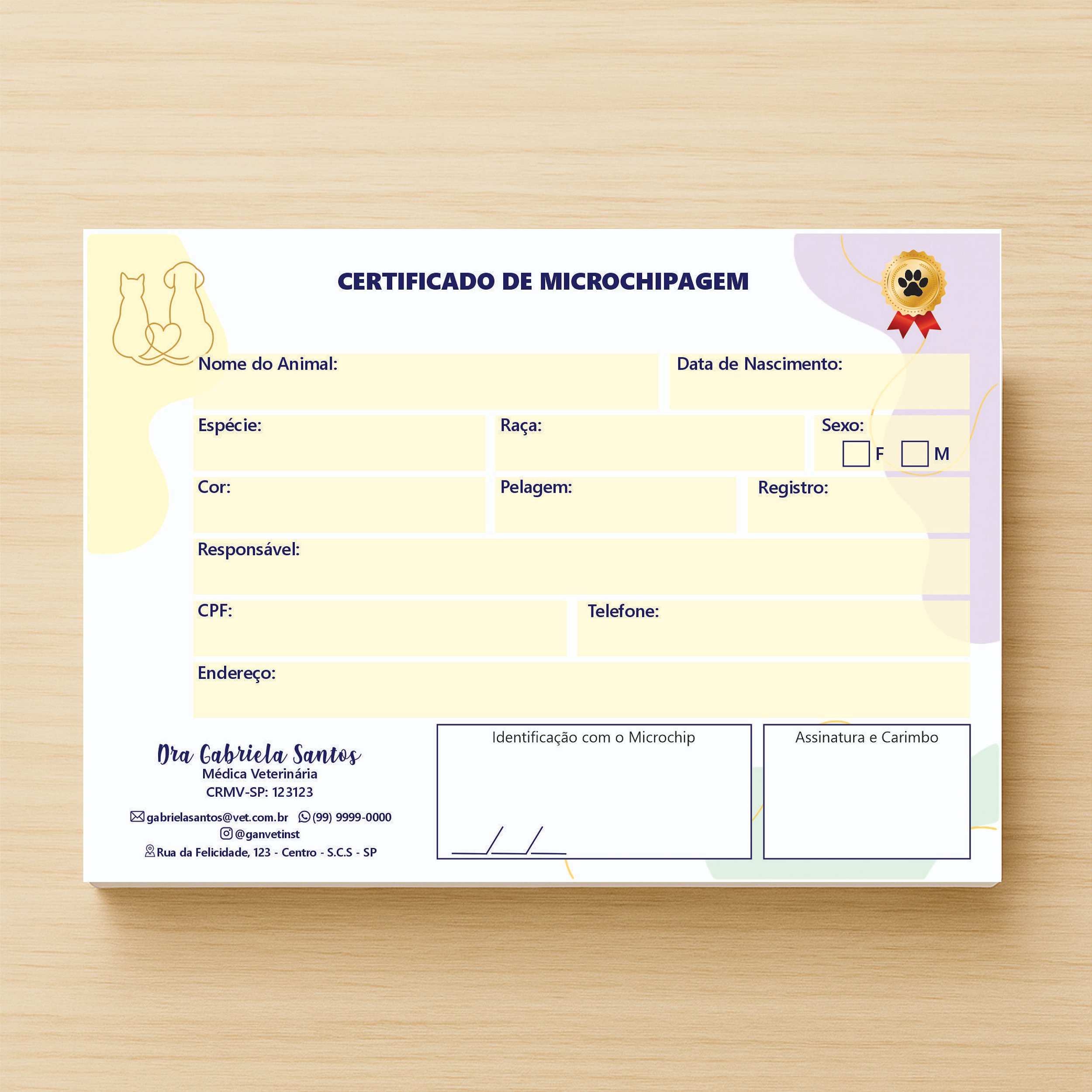 Nosso Certificado de Microchipagem Veterinário é ideal para comprovar o procedimento realizado e garantir mais segurança e identificação para o seu animal de estimação. Além de funcionar como um documento oficial, ele também serve como uma lembrança elegante e duradoura, valorizando o cuidado e a atenção que você dedica ao seu pet.