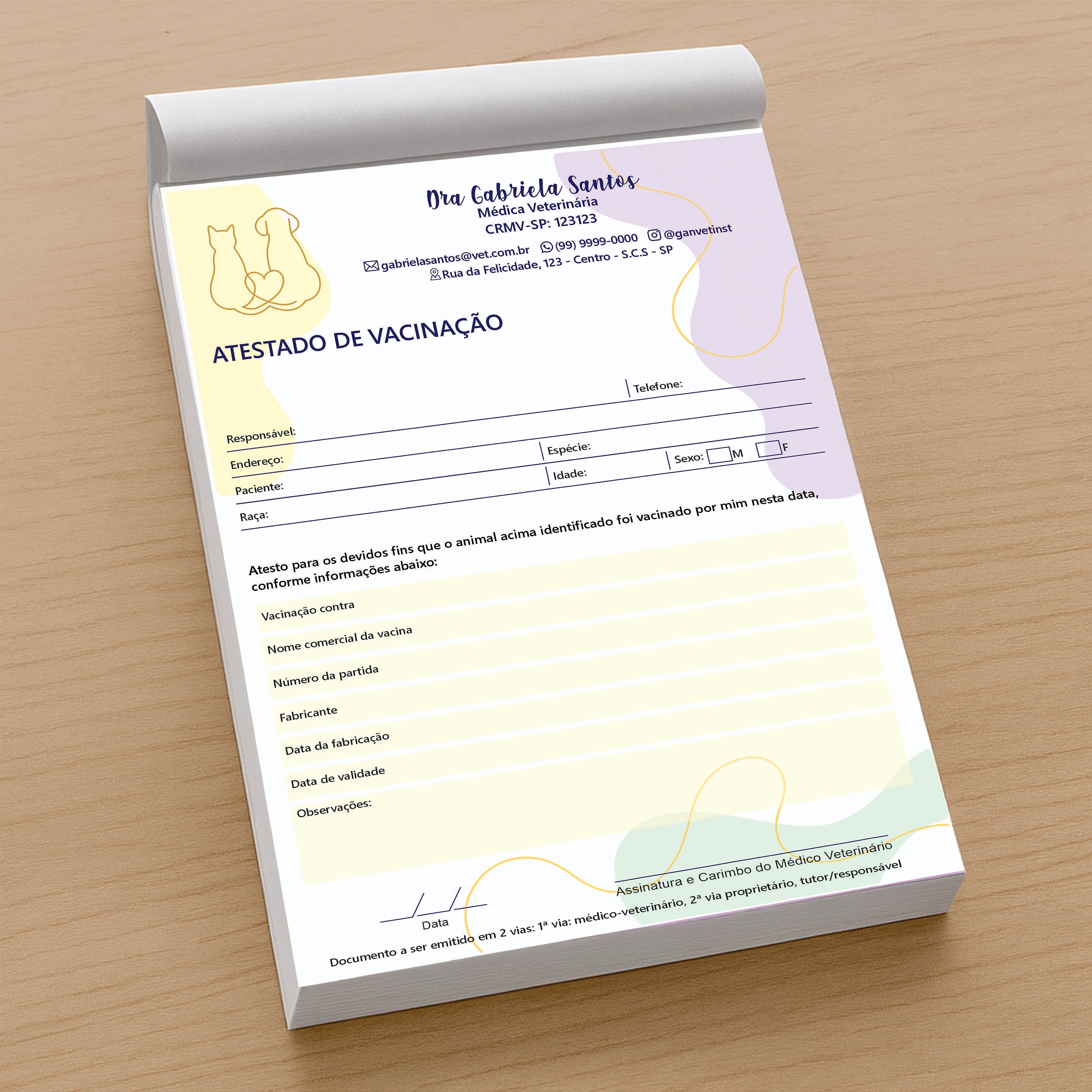 Transmita confiança, organização e credibilidade em seus atendimentos com o Atestado de Vacinação Personalizado. Produzido com materiais de qualidade superior, ele oferece uma apresentação impecável, além de resistência e durabilidade, ideal para o dia a dia em clínicas, consultórios ou atendimentos domiciliares.
