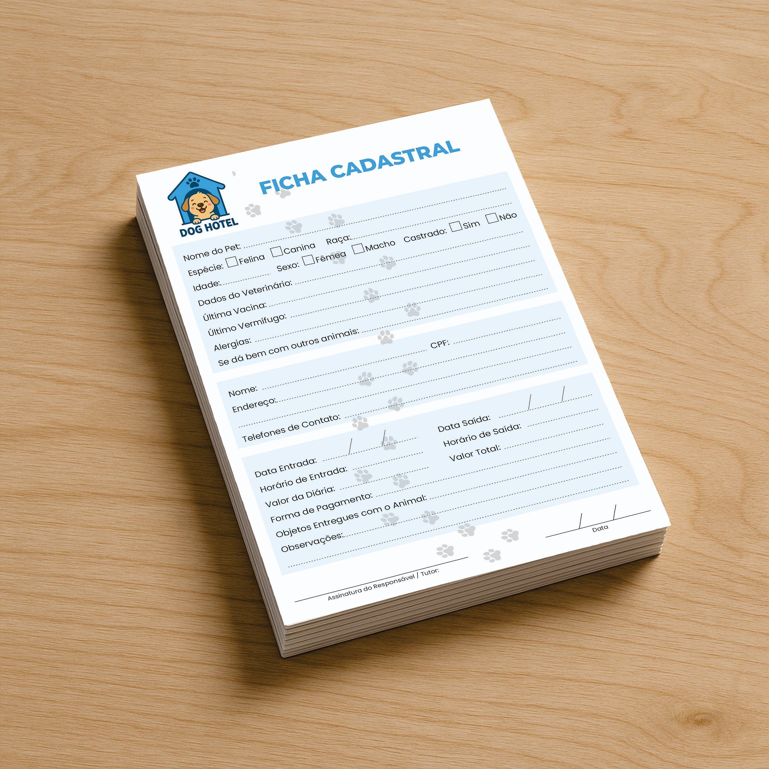 Nosso bloco de fichas cadastrais é ideal para hotéis, creches e clínicas pet que desejam manter o controle das informações dos animais e tutores de forma rápida, organizada e profissional.