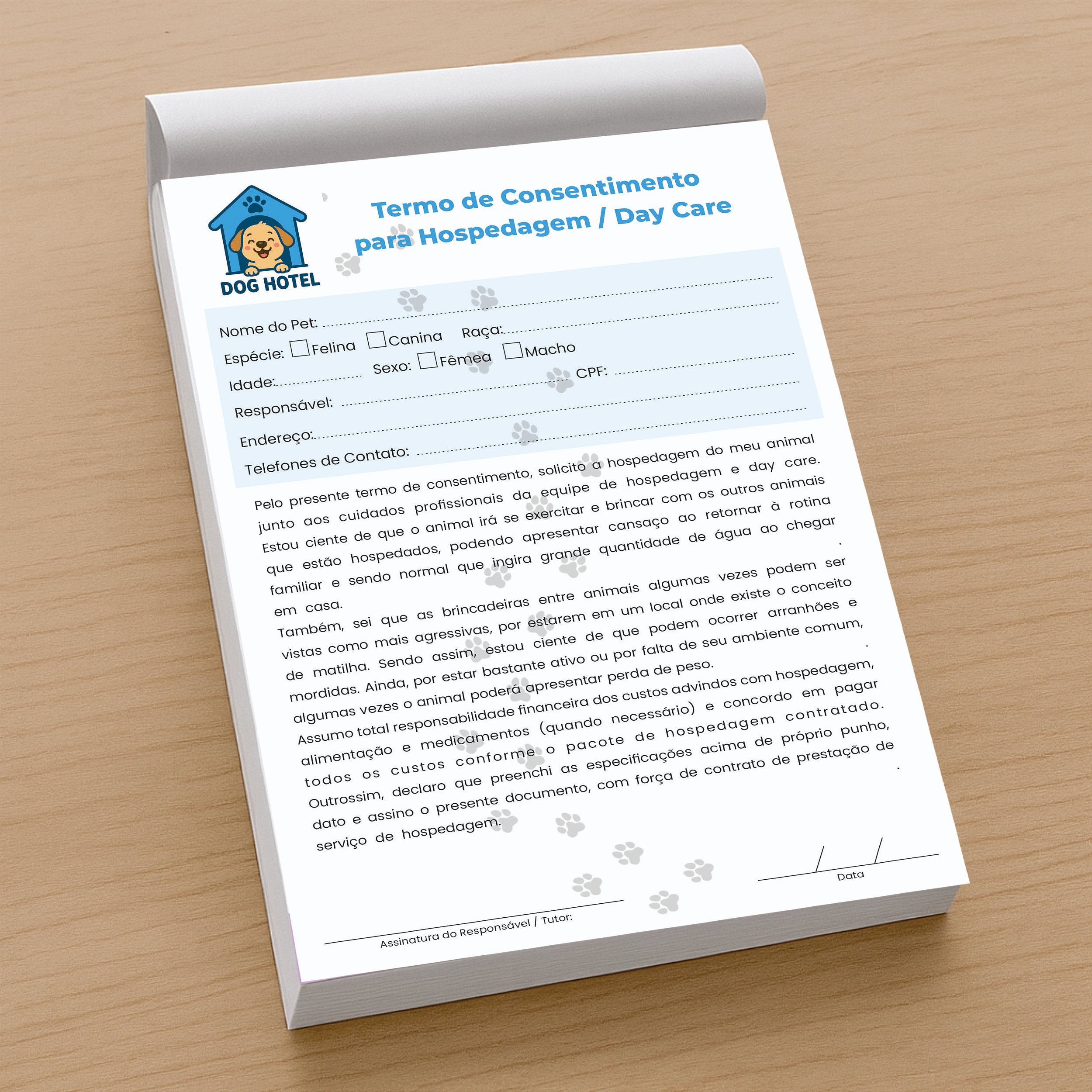Contrato de Serviço Hotel Pet / Day Care | Personalizado | Logo ou Marca | 14,8x21cm - 90g